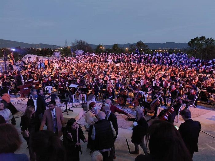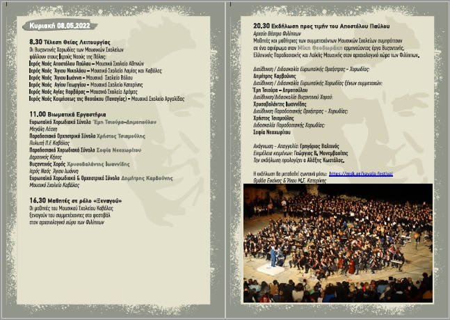 Το αποκορύφωμα του μουσικού αυτού ταξιδιού ήταν η μεγαλειώδης συναυλία που πραγματοποιήθηκε στο κατάμεστο Αρχαίο Θέατρο Φιλίππων, την Κυριακή το βράδυ. Στον επιβλητικό αυτό χώρο, 1200 μαθητές και μαθήτριες από 18 Μουσικά Σχολεία της χώρας και 8 Εκπαιδευτικά Ιδρύματα του Εξωτερικού ερμήνευσαν μοναδικά έργα από την εκκλησιαστική και την παραδοσιακή μας μουσική καθώς και έργα του Μίκη Θεοδωράκη υπό τη δ/νση των Δημήτρη Καρβούνη, Έμης Τσιούρα – Δημοπούλου, Χρυσοβαλάντη Ιωαννίδη, Χρήστου Τσιαμούλη και Σοφίας Νεοχωρίτου. Την ευθύνη της παρουσίασης είχαν οι Γρηγόρης Βαλτινός και Αλέξης Κωστάλας και την επιμέλεια των κειμένων ο Γιώργος Μονεμβασίτης.