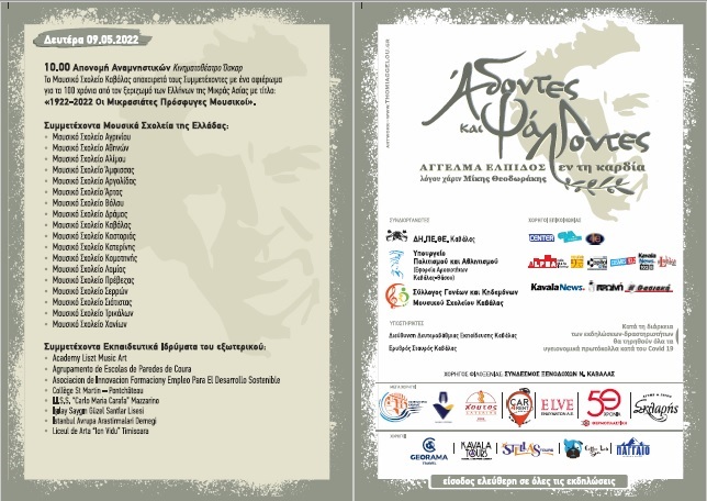 Το Μουσικό Σχολείο Σερρών με μια ομάδα από 33 μαθητές και μαθήτριες και 4 εκπαιδευτικούς συμμετείχε στο φεστιβάλ των Μουσικών Σχολείων «Άδοντες και Ψάλλοντες εν τη καρδία, λόγου χάριν Μίκης Θεοδωράκης», που πραγματοποιήθηκε για 6η χρονιά φέτος και συνδιοργάνωσαν ο Δήμος Καβάλας, η Ιερά Μητρόπολη Φιλίππων Νεαπόλεως & Θάσου, η Περιφέρεια Ανατολικής Μακεδονίας & Θράκης και το Μουσικό Σχολείο Καβάλας από τις 05 έως τις 09 Μαΐου 2022. Με αφορμή την πρόσφατη εκδημία του Μίκη Θεοδωράκη η φετινή διοργάνωση ήταν αφιερωμένη στον σπουδαίο μουσικοσυνθέτη.