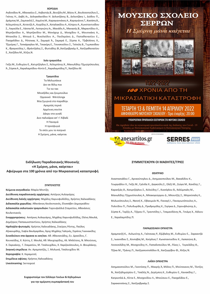 Πραγματοποιήθηκαν δύο συναυλίες, την Τετάρτη 30-03-2022 και την Πέμπτη 31-3-2022, στην αίθουσα εκδηλώσεων του Μουσικού Σχολείου Σερρών (μεγάλο Αμφιθέατρο).